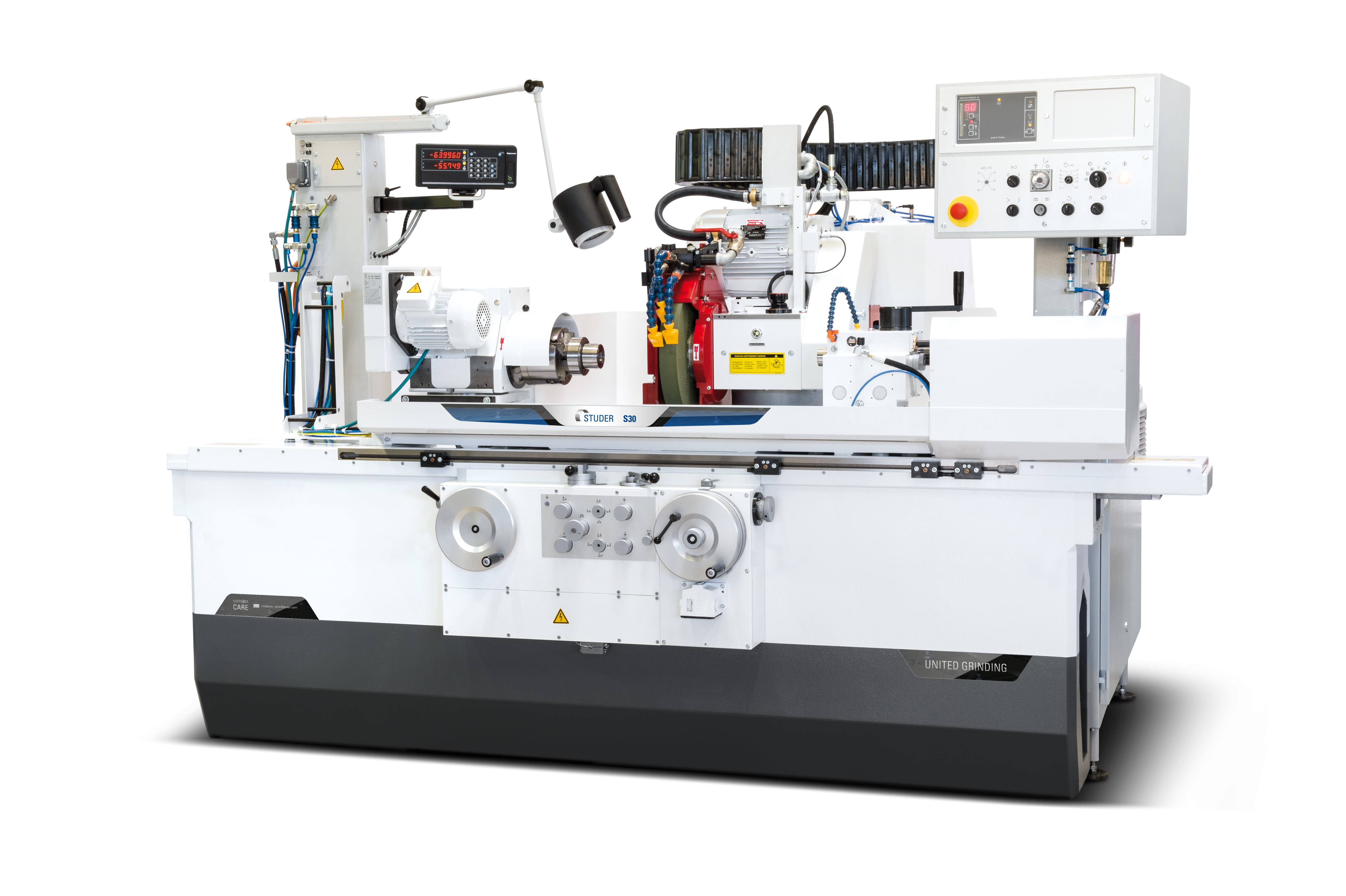 -轉(zhuǎn)塔式砂輪頭架,可配置左置外圓磨削砂輪和右置外圓磨削砂輪及內(nèi)圓磨削附件(選項),帶5度分度手動齒牙盤,可在0度至180度定位