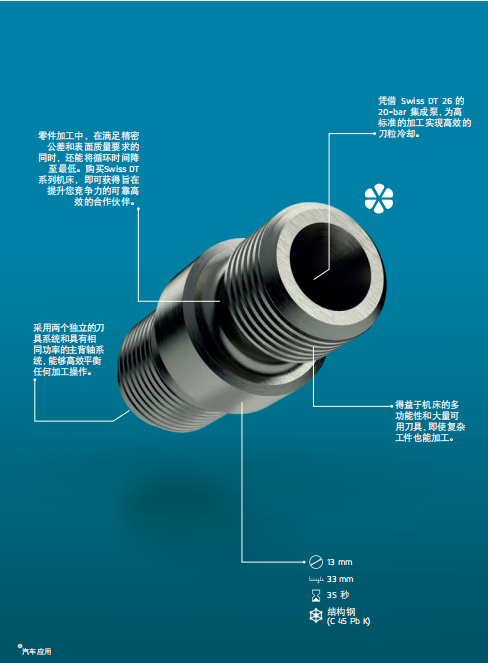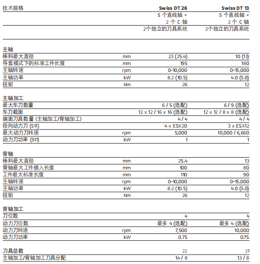 Swiss DT 系列瑞士型車床專業(yè)設(shè)計滿足典型長 短車削工件的各種要求。該系列機(jī)床簡單易 用,加工直徑達(dá) 13 和 25.4 mm,可顯著提高生 產(chǎn)效率。Swiss DT 系列采用先進(jìn)的技術(shù)和高效的五軸運動結(jié)構(gòu),是所有車削和銑削加工的理想之選。